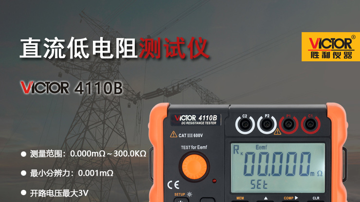 VICTOR 4110B 直流低電阻測試儀采用直流激勵4極法測量,適用于測量電纜的導(dǎo)線電阻,開關(guān)、接插件、繼電器的接觸電阻,線圈、電動機、變壓器繞組的電阻以及金屬鉚接電阻,金屬構(gòu)件之間聯(lián)結(jié)電阻測試,低值電阻測試,地網(wǎng)地極間連接導(dǎo)體的電阻測試,接觸電阻測試。