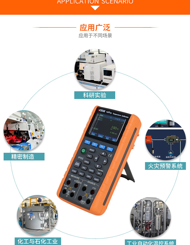 VICTOR 14Pro 溫度校驗儀具有高精度測量/輸出熱電偶或熱電阻信號,可滿足現(xiàn)場高精度,高可靠性的溫度設(shè)備的調(diào)試和校準,并在石油化工、生物制藥、工業(yè)自動化、大專院校和科研機構(gòu)等領(lǐng)域的得到了廣泛的應用。