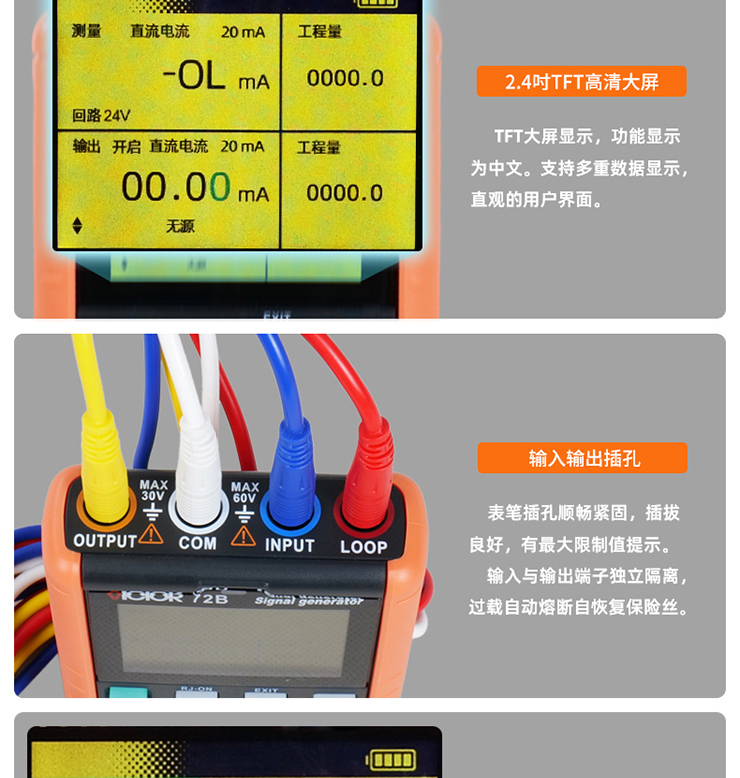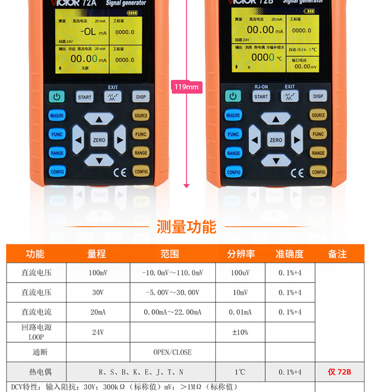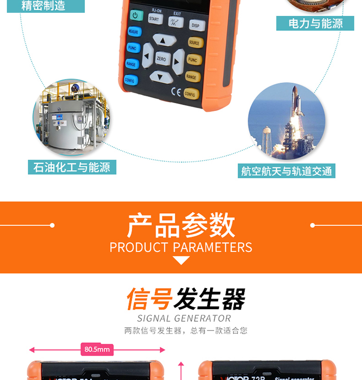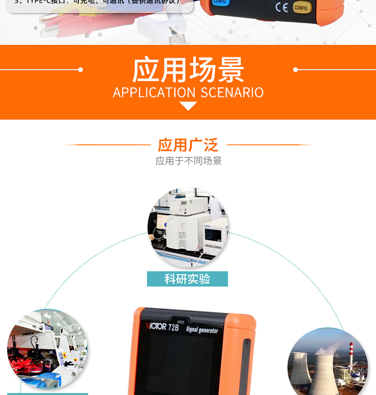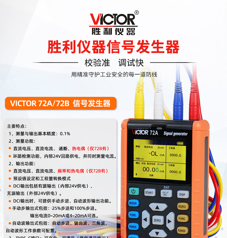信號發(fā)生器,可用于測量直流電壓、直流電流、通斷,可模擬輸出直流電壓、直流電流、熱電偶、頻率。適用于現(xiàn)場變送器、DCS、PLC等系統(tǒng)的調(diào)試和校準。VICTOR 72B在石油化工、生物制藥、工業(yè)自動化、大專院校和科研機構(gòu)等領(lǐng)域的得到了廣泛的應用,是工程師、技術(shù)工人及科研人員的“口袋級”實用工具。