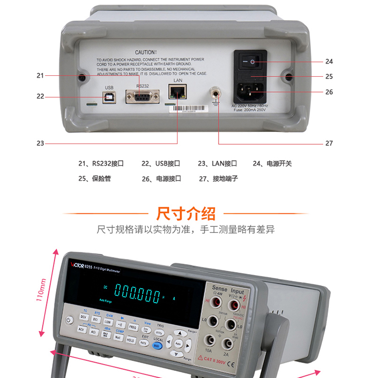 6. 交流測(cè)量為真有效值測(cè)量(RMS),交流帶寬可達(dá)100kHz。