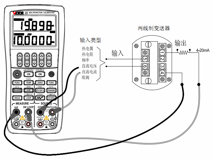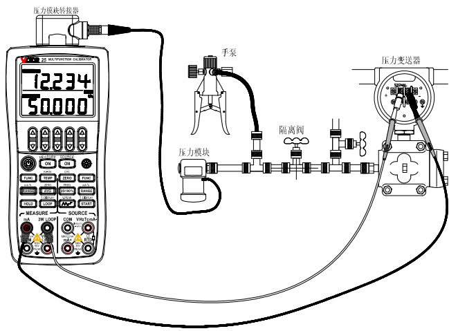 將VICTOR 25多功能校驗(yàn)儀的輸入設(shè)置為提供回路電壓同時(shí)測(cè)量電流,輸出設(shè)置為壓力,通過改變外部壓力源的輸出壓力,便可對(duì)壓力變送器進(jìn)行校準(zhǔn)。