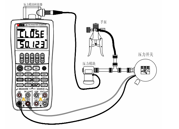 VICTOR25輸入設(shè)置為開關(guān)量測(cè)量功能,輸出設(shè)置為壓力輸出,緩慢地改變壓力源的輸出壓力,當(dāng)壓力開關(guān)動(dòng)作時(shí),VICTOR25發(fā)出一聲響,并鎖定這一時(shí)刻的輸出壓力顯示值和輸入的開關(guān)狀態(tài)。記住此值,按[START]鍵釋放輸出壓力顯示值并向相反的方向改變輸出壓力,當(dāng)壓力開關(guān)再次改變狀態(tài)時(shí),VICTOR25又發(fā)出一聲響,并鎖定壓力顯示值和輸入的開關(guān)狀態(tài),兩次壓力值之差即為壓力開關(guān)的回差。