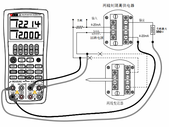 它的輸出端與供電電源共用兩根線,在此之間產(chǎn)生4~20mA的變化電流,并與輸入信號(hào)成比例。VICTOR 25所具有的同時(shí)輸出和測(cè)量并提供24V回路電源的功能,非常適合對(duì)各類的兩線制變送器進(jìn)行校準(zhǔn)。以頻率輸入的變送器為例,如上圖所示,VICTOR 25輸出設(shè)置為頻率,測(cè)量設(shè)置為mA,改變VICTOR 25的輸出頻率,輸入則會(huì)相應(yīng)變化,以此便可校準(zhǔn)這臺(tái)變送器。