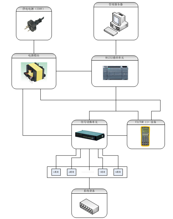 由上面框圖我們可以看出,過程信號源VICTOR 11+輸出的單路信號通過信號切換單元后,轉(zhuǎn)換為多路輸出信號,連接到系統(tǒng)設(shè)備,這樣就能滿足現(xiàn)場多通道信號輸出的要求;為了使得現(xiàn)場具有程控功能,管理服務(wù)器可通過RS232通訊單元,對信號切換單元以及VICTOR 11+進(jìn)行遠(yuǎn)程控制;電源模塊給RS232通訊單元、信號切換單元以及VICTOR 11+進(jìn)行供電,使得VICTOR 11+可連續(xù)工作,以滿足現(xiàn)場長時間工作的要求。