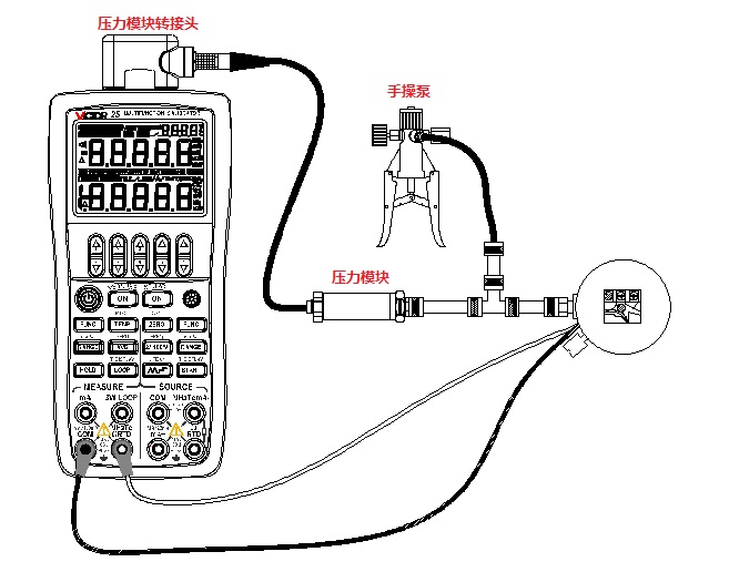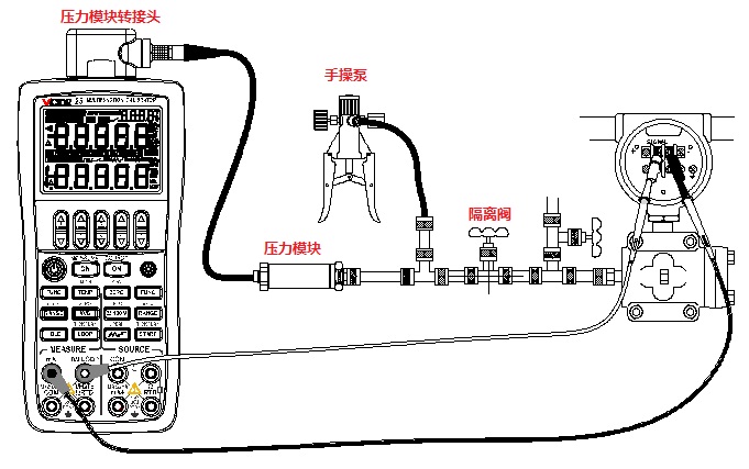 將VICTOR 25的輸入設(shè)置為提供回路電壓同時測量電流,輸出設(shè)置為壓力,通過改變外部壓力源的輸出壓力,便可對壓力變送器進行校準(zhǔn)。